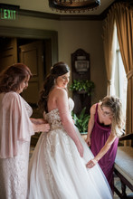 When Lindsey reached out to me about coming on board for her May 2019 wedding I was so excited! You see, Lindsey and I actually had met before...way back in 2013. Our story is so neat! Lindsey was the bridal consultant who helped me find my own dream dress for my own wedding at Modern Brides, a bridal boutique in Huntsville, Alabama. She was so good, too! I wanted something pretty unique but was having trouble finding it, so at the end of my appointment, Lindsey said, " Hang on a minute, I have something in the back that we just got in from market, that I think would go perfectly with the wedding you are planning...but be open minded!" So she came back carrying this giant champagne colored tulle ballgown ( I had been trying on nothing but white lace gowns!), and I was like, "Umm it's Gold, but it's gorgeous!" I probably looked like the heart eyes emoji! I tried it on and when I stepped on that pedestal I just couldn't stop smiling. It made me feel like the princess I never knew I wanted to be! HaHa! And she was soooo right! It was perfect for my wedding and venue! It even fit like a glove and required no alterations, so I bought it on the spot right there! Then Lindsey helped us pick out bridesmaid dresses that same day that were also perfect! You can see baby Lindsey in the background of that last photo below ( she's the cutie in the blue dress!).